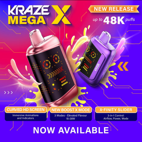 Presenting the Kraze Mega X, a cutting-edge disposable intended for vapers seeking complete control and powerful performance. Bold, powerful flavor is produced by its dual mesh sub-ohm coil and VPU processor, which deliver up to 28W in three settings. A curved HD display displays battery, e-liquid, and power in real time, while the X-Finity Slider allows users to easily change airflow, wattage, and mode. With 20 mL of e-liquid and a 1000 mAh rechargeable battery, the Mega X can produce up to 48,000 puffs.