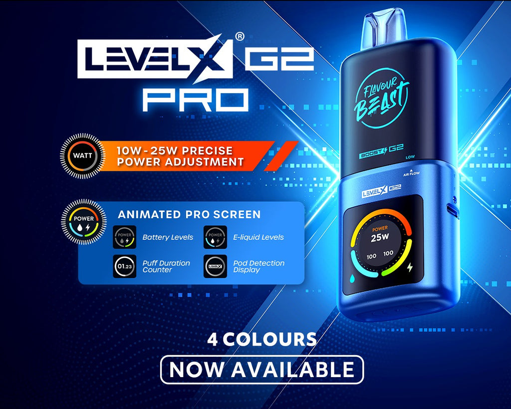 The Level X Pro Device offers precise 10W-25W power adjustment with an animated PRO screen that tracks battery, e-liquid levels, and power settings.