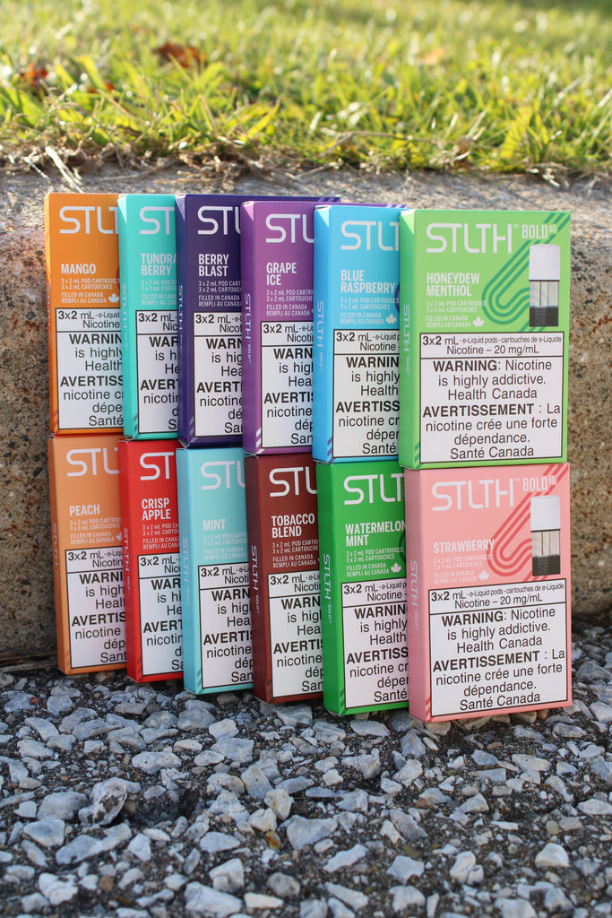 A specifically crafted range of flavors, designed specifically for STLTH, come in four nicotine variations: 0 mg/mL, 20 mg/mL, Bold 35, and Bold 50.